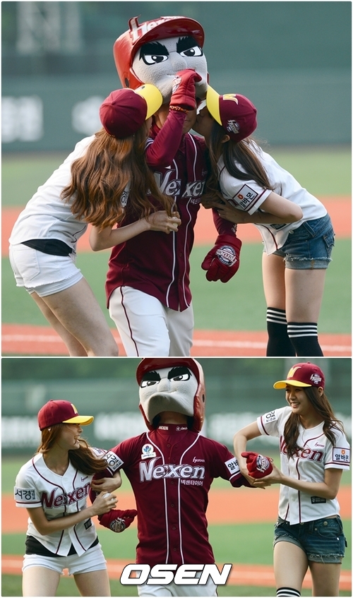 7일 오후 서울 목동구장에서 열린 2012 팔도 프로야구 넥센 히어로즈와 LG 트윈스와의 경기에 앞선 승리기원 시구,시타 행사에서 턱돌이가 걸그룹 헬로비너스 유영, 나라의 승리기원 뽀뽀을 받고 기뻐하고 있다.