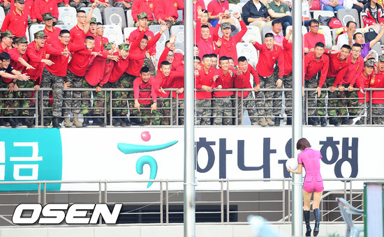 7일 저녁 경기도 화성 종합경기타운에서 대한민국 대 시리아 올림픽대표팀 평가전이 열릴 예정인 가운데 나인뮤지스가 사전공연을 펼친 후 나인뮤지스의 은지가 사인볼을 던지려하자 해병대들이 환호하며 공을 받으려 하고 있다.