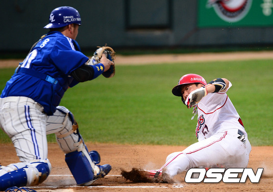 7일 오후 광주 무등야구장에서 열린 '2012 팔도 프로야구' KIA 타이거즈와 삼성 라이온즈의 경기, 1회말 2사 1,2루 KIA 최희섭의 우중간 1타점 적시타때 1루주자 김원섭이 홈으로 쇄도하고 있다.