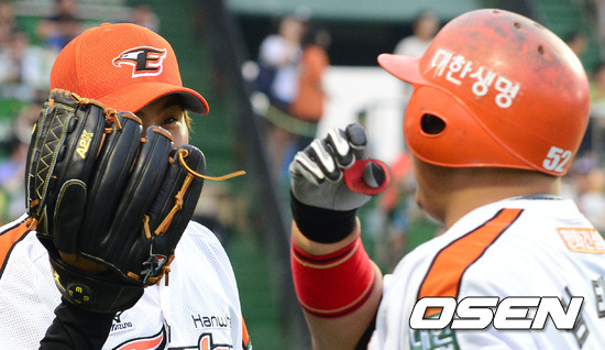 7일 오후 대전구장에서 열린 '2012 팔도 프로야구' 한화 이글스와 롯데 자이언츠의 경기, 2회말 1사 만루에서 한화 류현진이 큼지막한 타구를 날렸지만 외야플라이로 물러난 김태균과 이야기를 나누고 있다.