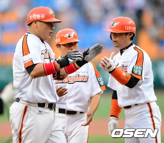 7일 오후 대전구장에서 열린 '2012 팔도 프로야구' 한화 이글스와 롯데 자이언츠의 경기, 1회말 1사 1,3루에서 한화 김태균이 스리런 홈런을 날리고 홈을 밟으며 강동우와 하이파이브를 하고 있다.