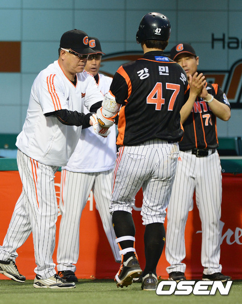 7일 오후 대전구장에서 열린 '2012 팔도 프로야구' 한화 이글스와 롯데 자이언츠의 경기, 4회초 무사 1루에서 롯데 강민호가 투런포를 날리고 더그아웃에서 양승호 감독과 하이파이브를 하고 있다.