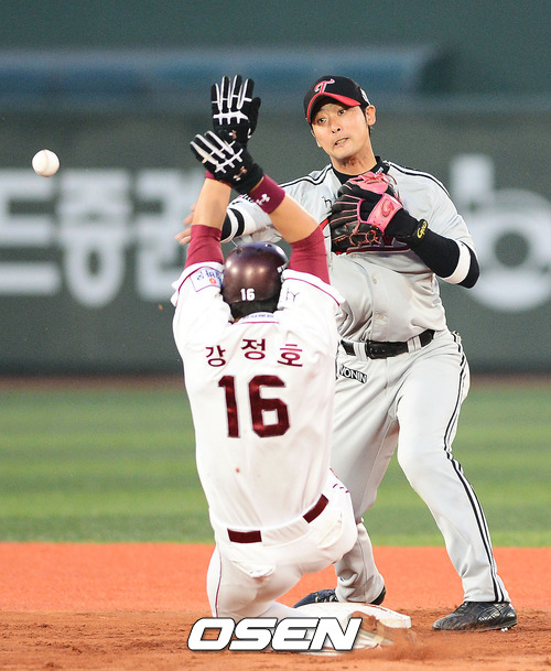 7일 오후 서울 목동구장에서 열린 2012 팔도 프로야구 넥센 히어로즈와 LG 트윈스와의 경기, 4회초 무사 1루 오윤 내야땅볼때 LG 서동욱 2루수가 1루주자 강정호를 2루에서 포스아웃 시키며 병살처리 시키고 있다.