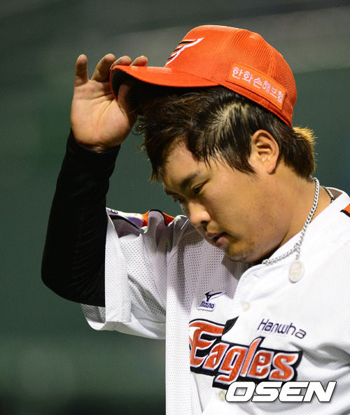 7일 오후 대전구장에서 열린 '2012 팔도 프로야구' 한화 이글스와 롯데 자이언츠의 경기, 5회초 수비를 마친 한화 류현진이 더그아웃으로 향하고 있다. 류현진은 5회까지 3실점.