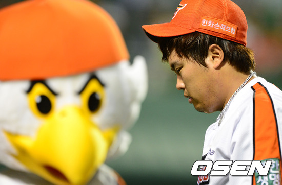 7일 오후 대전구장에서 열린 '2012 팔도 프로야구' 한화 이글스와 롯데 자이언츠의 경기, 5회초 수비를 마친 한화 류현진이 더그아웃으로 향하고 있다. 류현진은 5회까지 3실점.