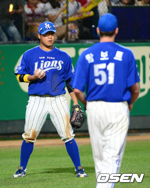 7일 오후 광주 무등야구장에서 열린 '2012 팔도 프로야구' KIA 타이거즈와 삼성 라이온즈의 경기, 3회말 2사 2루 KIA 이범호의 땅볼타구를 잡은 삼성 박석민이 1루에 주자가 있는 것으로 착각, 2루주자 이용규를 포스아웃으로 처리하려했으나 세이프가 선언되자 당황해하고 있다.