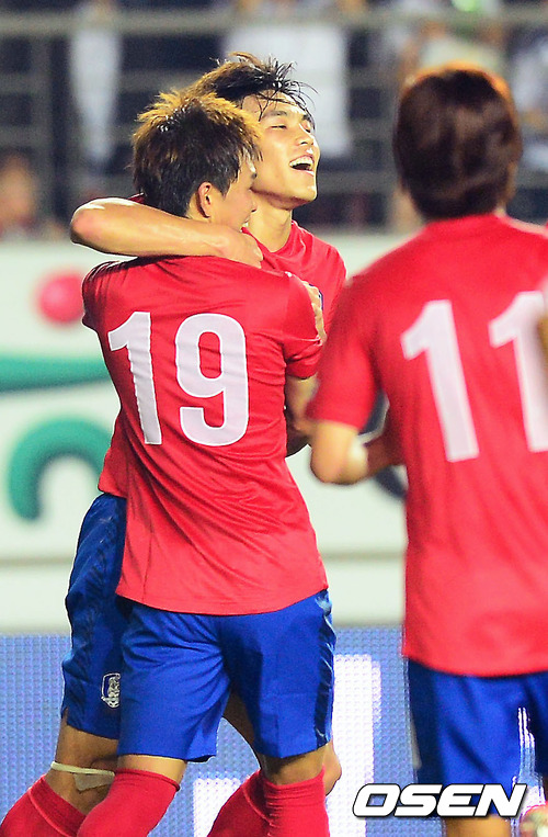 7일 저녁 경기도 화성 종합경기타운에서 열린 대한민국 대 시리아 올림픽대표팀 평가전에서 전반 한국 김기희가 선제골에 성공한 후 동료들과 기쁨을 나누고 있다.