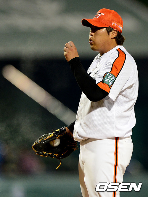 7일 오후 대전구장에서 열린 '2012 팔도 프로야구' 한화 이글스와 롯데 자이언츠의 경기, 5회초 한화 류현진이 손가락에 묻은 로진가루를 불고 있다. 류현진은 5회까지 3실점하고 6회 정민혁에 마운드를 넘겼다.