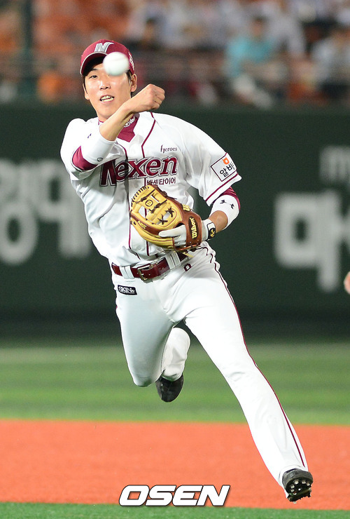 7일 오후 서울 목동구장에서 열린 2012 팔도 프로야구 넥센 히어로즈와 LG 트윈스와의 경기, 7회초 2사 2루 이대형 3루앞 땅볼때 넥센 3루수 유재신이 멋진송구로 아웃처리 시키고 있다.