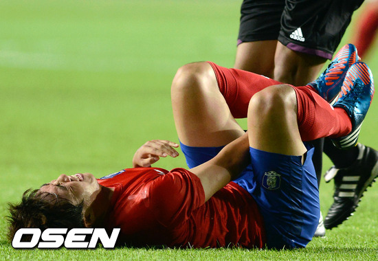 7일 저녁 경기도 화성 종합경기타운에서 열린 대한민국 대 시리아 올림픽대표팀 평가전에서 전반 한국 서정진이 시리아 선수와 충돌 후 그라운드에 누워 고통스러워하고 있다.