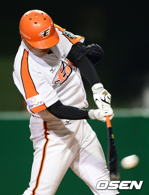 7일 오후 대전구장에서 열린 '2012 팔도 프로야구' 한화 이글스와 롯데 자이언츠의 경기, 7회말 무사에서 한화 최진행이 2루타를 날리고 있다.