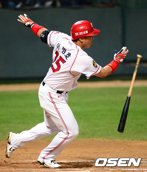 7일 오후 광주 무등야구장에서 열린 '2012 팔도 프로야구' KIA 타이거즈와 삼성 라이온즈의 경기, 7회말 1사 1루 KIA 이범호가 중전 안타를 치고 있다.