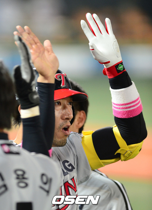 7일 오후 서울 목동구장에서 열린 2012 팔도 프로야구 넥센 히어로즈와 LG 트윈스와의 경기, 8회초 2사 정성훈 우월솔로 홈런을 날리고 덕아웃 동료들의 축하를 받고 있다.