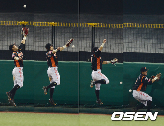 7일 오후 대전구장에서 열린 '2012 팔도 프로야구' 한화 이글스와 롯데 자이언츠의 경기, 7회말 무사에서 롯데 전준우가 한화 최진행의 타구에 몸을 날렸으나 놓치고 있다. 최진행은 2루타.