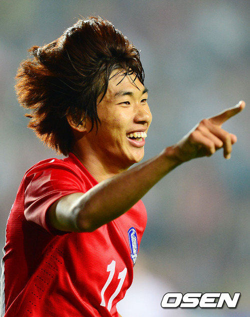 7일 저녁 경기도 화성 종합경기타운에서 열린 대한민국 대 시리아 올림픽대표팀 평가전에서 전반 한국 윤일록이 골에 성공한 후 기뻐하고 있다.