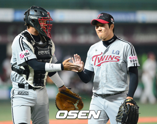 7일 오후 서울 목동구장에서 열린 2012 팔도 프로야구 넥센 히어로즈와 LG 트윈스와의 경기, 8회말 수비를 마친 LG 유원상이 심광호 포수의 격려를 받으며 덕아웃을 향하고 있다.