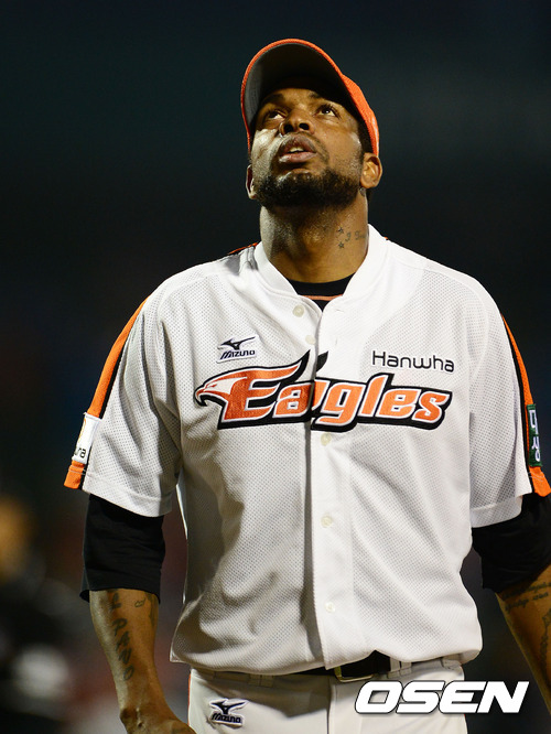 7일 오후 대전구장에서 열린 '2012 팔도 프로야구' 한화 이글스와 롯데 자이언츠의 경기, 8회초 2사 2루에서 한화 바티스타가 롯데 김문호를 내야땅볼로 처리하고 더그아웃으로 향하고 있다.