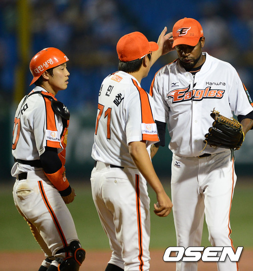 7일 오후 대전구장에서 열린 '2012 팔도 프로야구' 한화 이글스와 롯데 자이언츠의 경기, 9회초 무사에서 한화 바티스타가 롯데 박준서에 볼넷을 허용하고 교체되고 있다.