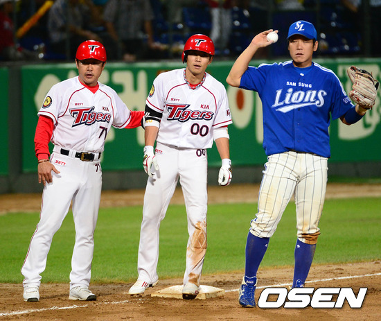 7일 오후 광주 무등야구장에서 열린 '2012 팔도 프로야구' KIA 타이거즈와 삼성 라이온즈의 경기, 8회말 1사 2루 KIA 이호신이 우전 1타점 적시타를 치고 3루에서 백인호 코치의 격려를 받고 있다.