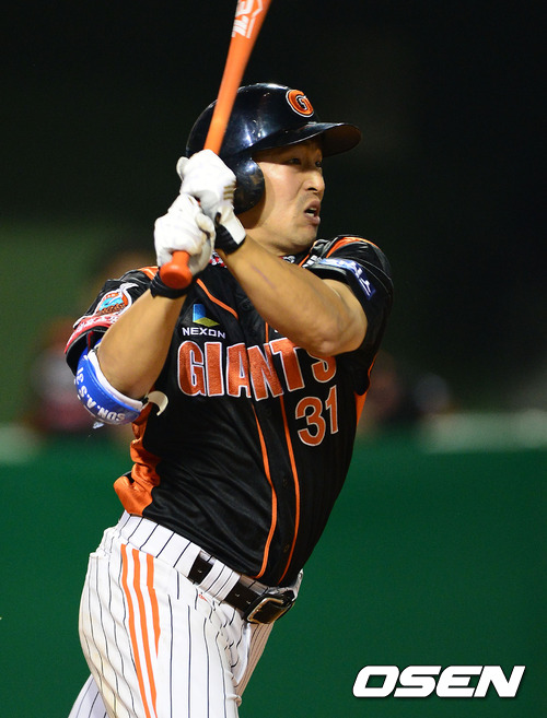 7일 오후 대전구장에서 열린 '2012 팔도 프로야구' 한화 이글스와 롯데 자이언츠의 경기, 9회초 무사 만루에서 롯데 손아섭이 역전 2타점 적시타를 날리고 타구를 바라보고 있다.