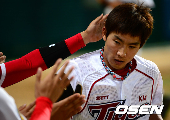 7일 오후 광주 무등야구장에서 열린 '2012 팔도 프로야구' KIA 타이거즈와 삼성 라이온즈의 경기, 8회말 1사 3루 KIA 이용규의 희생플라이때 득점에 성공한 3루주자 이호신이 더그아웃에서 동료들의 축하를 받고 있다.