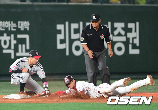 9회말 1사 루 유한준 좌익선상 안타때 1루주자 장기영 3루까지 뛰었으나 태그아웃 처리되고 있다./ ajyoung@osen.co.kr