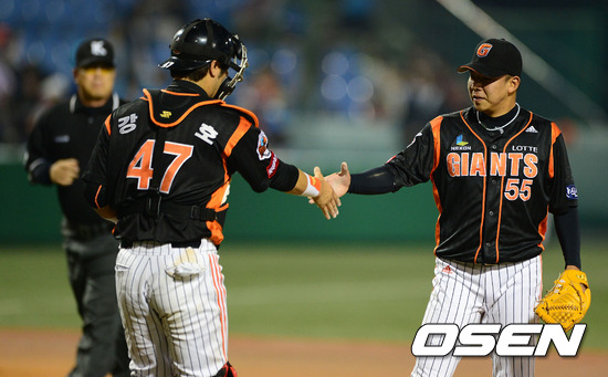 기분좋은 역전승을 거둔 롯데 김사율이 강민호와 악수를 하고 있다. /jpnews@osen.co.kr