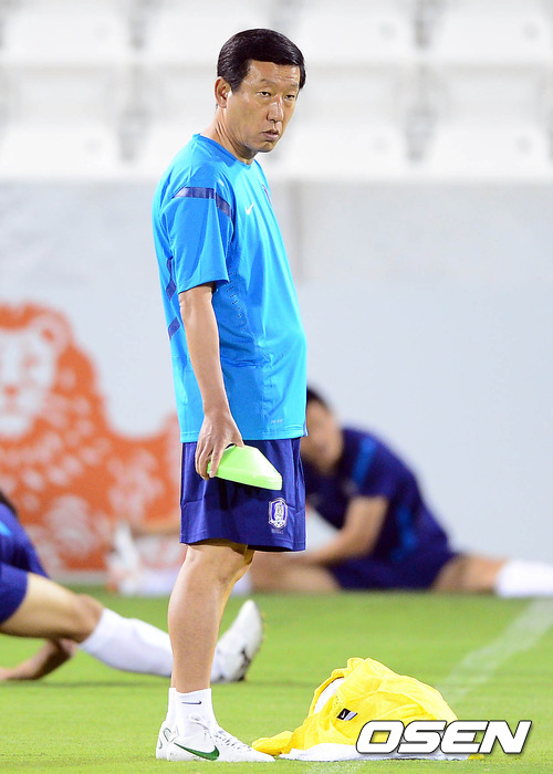 7일 오후(현지시각) 카타르 도하 알 사드 스타디움에서 열린 대표팀 훈련에서 선수들이 몸을 풀고있는 가운데, 최강희 감독이 그라운드를 바라보고 있다.
