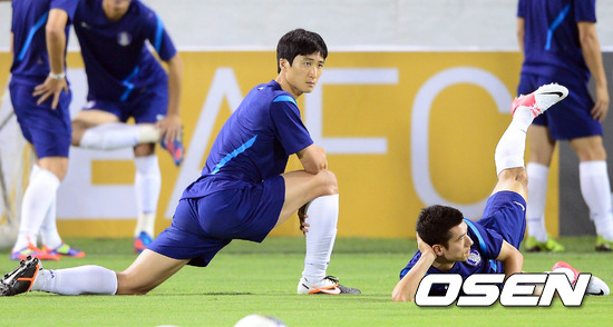 7일 오후(현지시각) 카타르 도하 알 사드 스타디움에서 열린 대표팀 훈련에서 곽태휘 최효진이 스트레칭을 하며 몸을 풀고 있다.