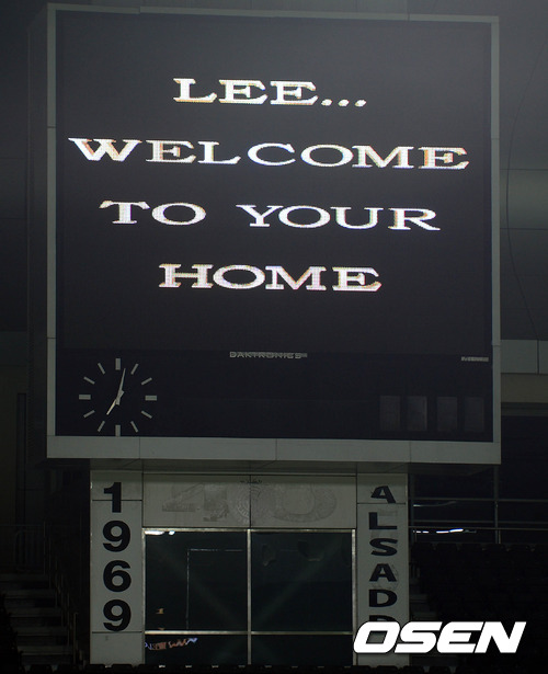 이날 경기를 앞두고 8일 마지막 훈련을 펼치던 중 알 사드 경기장 전광판에는 특별한 인사가 전해졌다. 바로 알 사드서 뛰고 있는 이정수를 위해 'Lee.... Welcome to your home'라는 인삿말이 새겨졌다. 홈 구장에서 열리는 만큼 살살해 달라는 이야기.