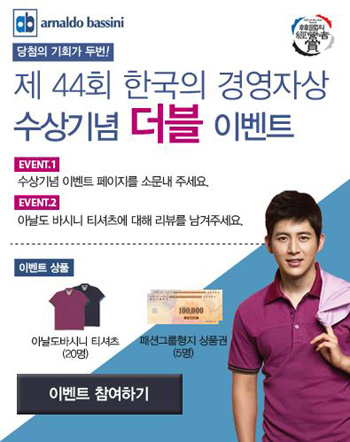 남성 캐주얼 '아날도바시니'가 한국능률협회(KMA) 주최 '한국의 경영자상' 수상을 기념해 5일부터 22일까지 아날도바시니 공식 홈페이지에서 '한국의 경영자상' 수상 기념 온라인 더블 이벤트를 진행한다.