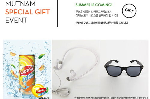 5만 원 이상은 립톤 아이스티, 7만 원 이상은 립톤 아이스티와 시크 선글라스, 15만 원 이상 구매한 소비자에게는 립톤 아이스티와 스포츠 헤드폰을 증정할 예정이다. 이번 이벤트는 5월 31일부터 6월 15일까지 진행된다.
