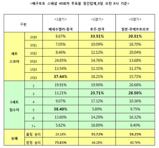 2경기 호주-한국전의 경우 호주의 승리(55.72%)를 전망한 참가자가 다수를 차지했다. 최종 세트스코어도 3-0 호주 승리가 33.51%로 최다 집계됐고, 1세트 점수차의 경우 3점이 23.71%로 가장 많았다. 호주는 예상을 깨고 공수 전반에서 활약을 펼치며 승승장구하고 있다. 한국은 3연패뒤 2승을 추가했지만, 사실상 런던올림픽 본선 진출은 불가능한 상태다. 분위기와 전력상 호주가 앞선다.