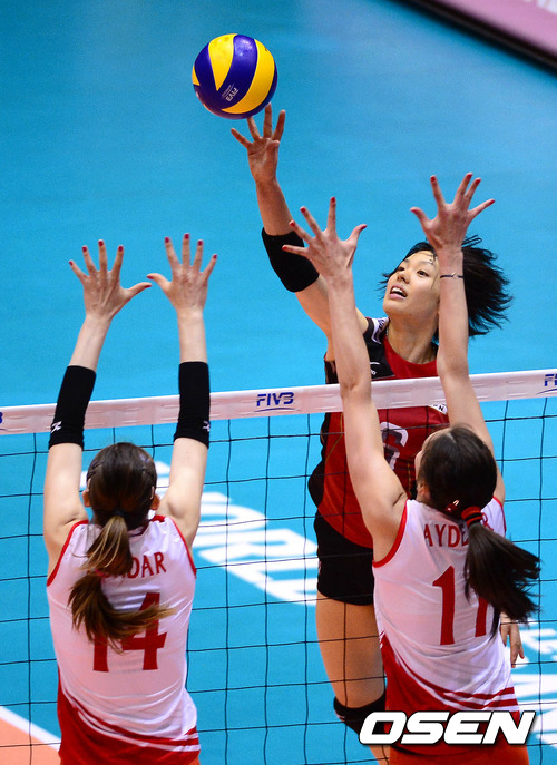 8일 오후 부산 사직실내체육관에서 열린 '2012 그랑프리 세계여자배구대회' 일본과 터키의 경기, 3세트 일본 사코다 사오리가 터키 수비의 블로킹을 피해 공격을 시도하고 있다.