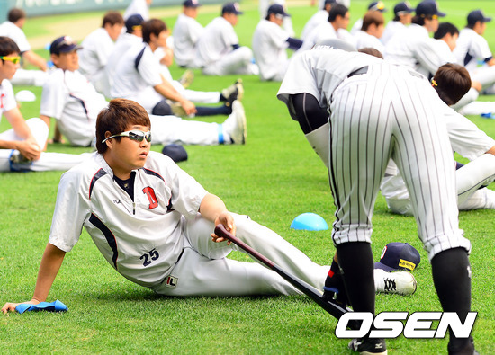 8일 오후 서울 잠실구장에서 열리는 2012 팔도 프로야구 LG 트윈스와 두산 베어스의 경기 전 두산 양의지가 스트레칭을 하며 LG 양영동과 이야기를 나누고 있다.