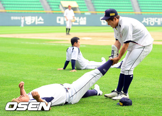 8일 오후 서울 잠실구장에서 열리는 2012 팔도 프로야구 LG 트윈스와 두산 베어스의 경기 전 두산 김현수가 최준석의 스트레칭을 돕고 있다,
