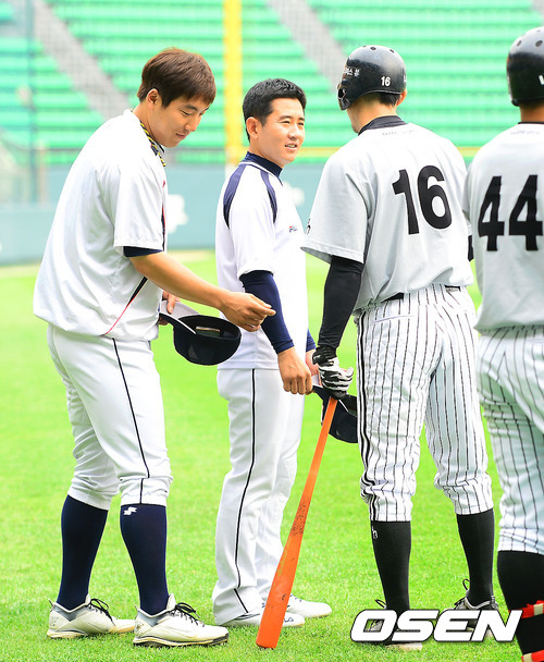 8일 오후 서울 잠실구장에서 열리는 2012 팔도 프로야구 LG 트윈스와 두산 베어스의 경기 전 두산 김현수가 LG 정성훈의 방망이를 탐내고 있다.