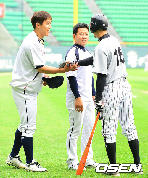 8일 오후 서울 잠실구장에서 열리는 2012 팔도 프로야구 LG 트윈스와 두산 베어스의 경기 전 두산 김현수가 LG 정성훈과 악수를 나누고 있다