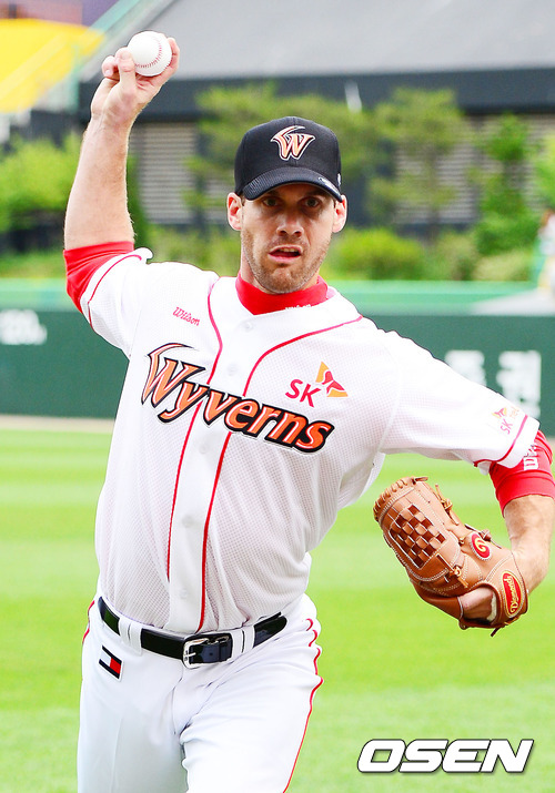 8일 오후 인천 문학구장에서 '2012 팔도 프로야구' SK 와이번스와 삼성 라이온즈의 경기가 열릴 예정인 가운데 SK에 새롭게 영입된 투수 부시가 취재진 앞에서 포즈를 취하고 있다.