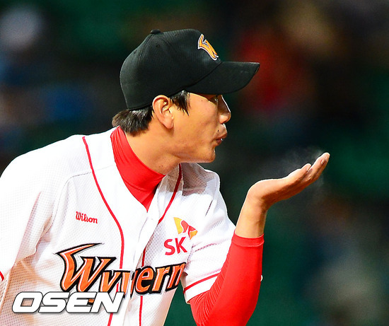 8일 오후 인천 문학구장에서 열린 '2012 팔도 프로야구' SK 와이번스와 삼성 라이온즈의 경기에서 5회초 SK 선발 김광현이 로진가루를 불고 있다.