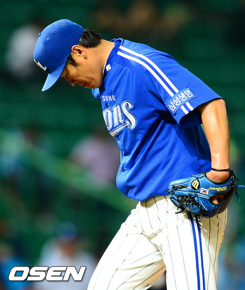 8일 오후 인천 문학구장에서 열린 '2012 팔도 프로야구' SK 와이번스와 삼성 라이온즈의 경기에서 5회말 2사 주자 만루가 되자 삼성 선발 정현욱이 고개를 떨구고 있다.