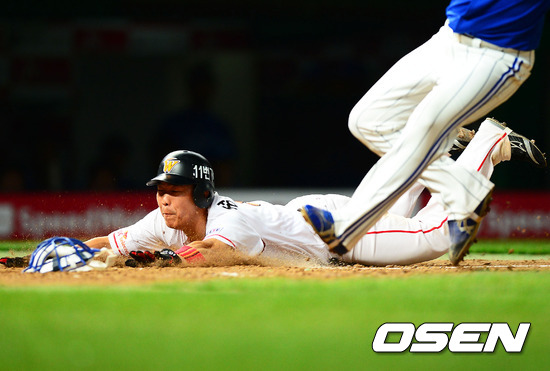 8일 오후 인천 문학구장에서 열린 '2012 팔도 프로야구' SK 와이번스와 삼성 라이온즈의 경기에서 5회말 2사 주자 만루 이호준 타석에서 정현욱 대신 교체 투입된 이우선의 폭투때 정근우가 홈에서 세이프되고 있다.