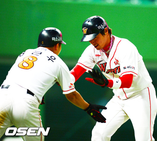 8일 오후 인천 문학구장에서 열린 '2012 팔도 프로야구' SK 와이번스와 삼성 라이온즈의 경기에서 5회말 2사 주자 만루 이호준 타석에서 정현욱 대신 교체 투입된 이우선의 폭투때 정근우가 홈에서 세이프되고 이어서 포수의 실책으로 홈 송구가 볼이 빠지자 임훈이 홈을 밟아 역전이됐다. 홈에서 임훈이 정근우와 하이파이브를 하고 있다.