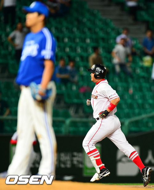 8일 오후 인천 문학구장에서 열린 '2012 팔도 프로야구' SK 와이번스와 삼성 라이온즈의 경기에서 5회말 2사 주자 3루 SK 이호준이 좌월 투런 홈런을 날린 후 그라운드들 돌고 있다.