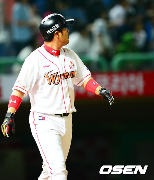 8일 오후 인천 문학구장에서 열린 '2012 팔도 프로야구' SK 와이번스와 삼성 라이온즈의 경기에서 5회말 2사 주자 3루 SK 이호준이 좌월 투런 홈런을 날린 후 타구를 바라보고 있다.
