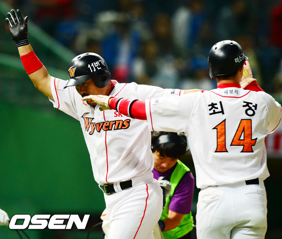 8일 오후 인천 문학구장에서 열린 '2012 팔도 프로야구' SK 와이번스와 삼성 라이온즈의 경기에서 5회말 2사 주자 3루 SK 이호준이 좌월 투런 홈런을 날린 후 홈에서 최정과 하이파이브를 하고 있다.