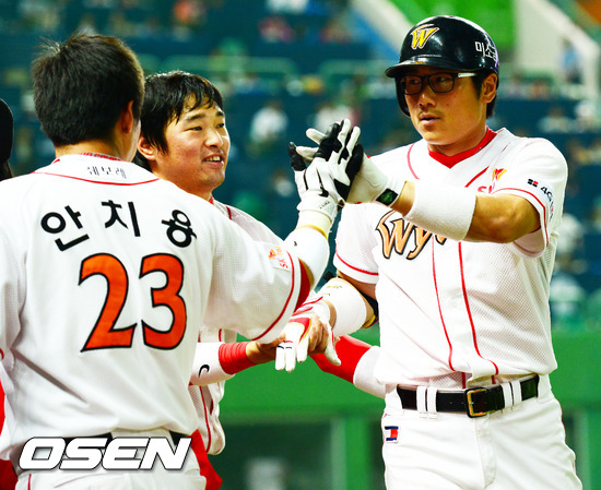 8일 오후 인천 문학구장에서 열린 '2012 팔도 프로야구' SK 와이번스와 삼성 라이온즈의 경기에서 6회말 첫타석에서 SK 박정권이 솔로홈런을 날린 후 덕아웃에서 동료들과 기쁨을 나누고 있다.