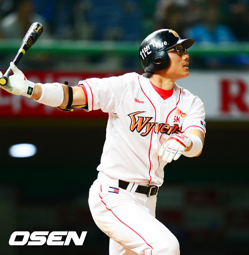 8일 오후 인천 문학구장에서 열린 '2012 팔도 프로야구' SK 와이번스와 삼성 라이온즈의 경기에서 6회말 첫타석에서 SK 박정권이 솔로홈런을 날리고 있다.