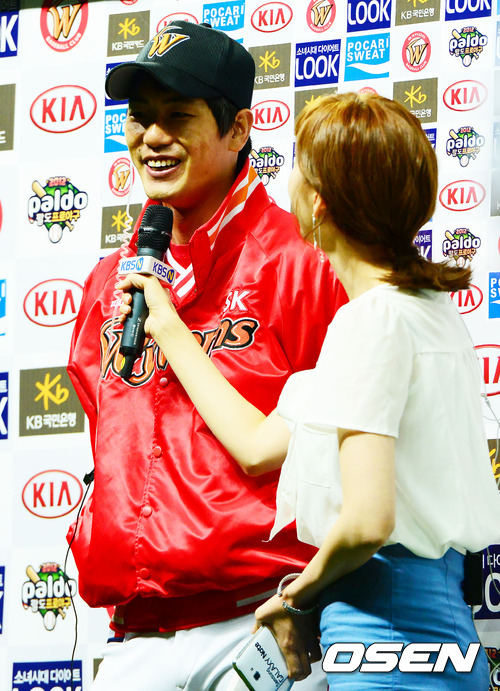 경기를 마치고 SK 김광현이 승리 인터뷰 중 KBS N 공서영 아나운서와 이야기를 나누며 환하게 웃고 있다. / rumi@osen.co.kr