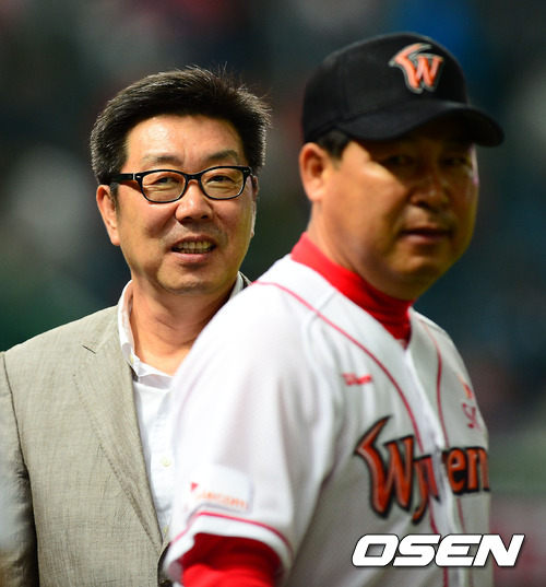 경기를 마치고 SK 와이번스 신영철 사장이 이만수 감독을 축하하고 있다. / rumi@osen.co.kr